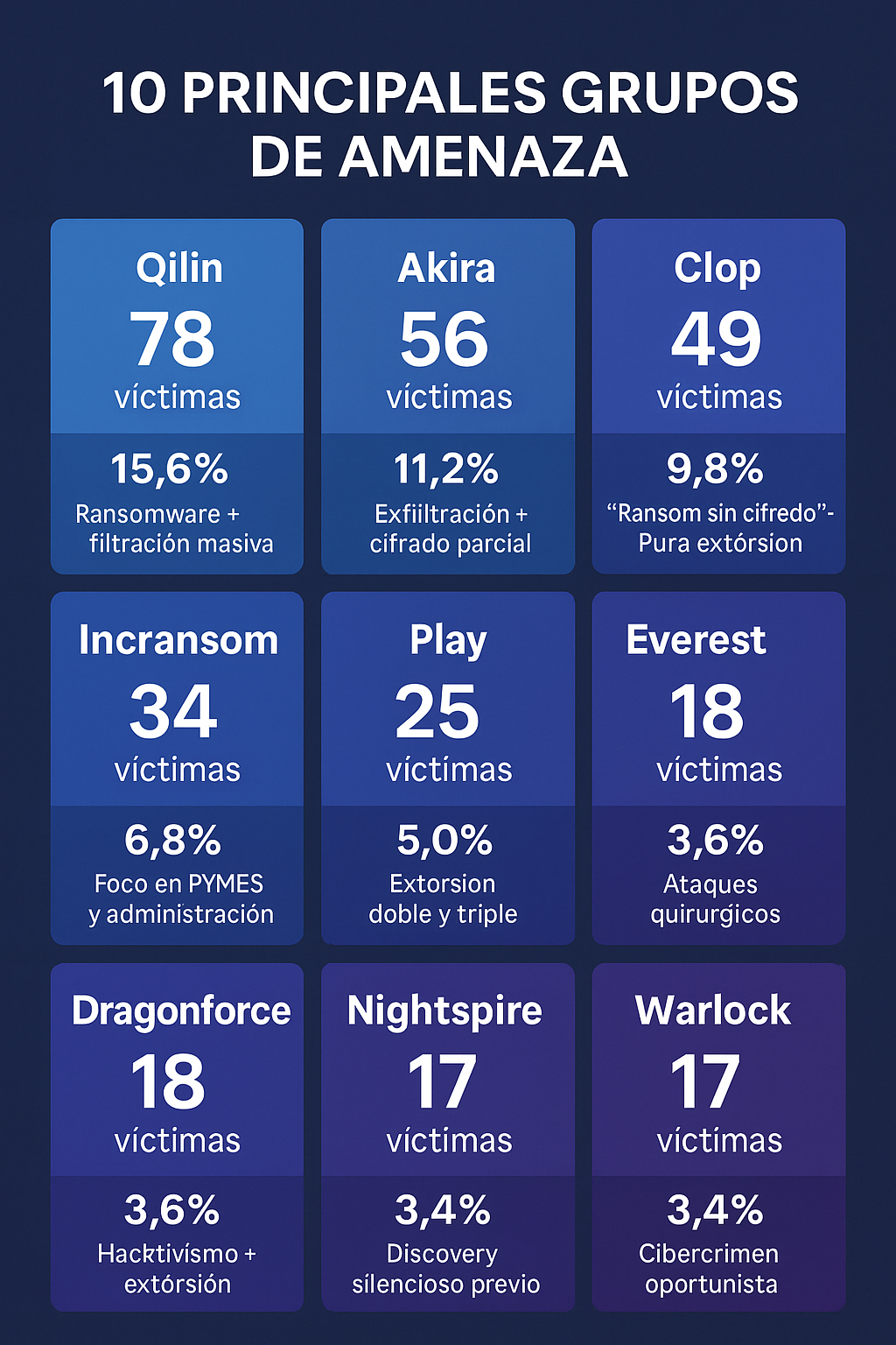 - El modelo RaaS (Ransomware as a Service) domina: Los top 3 grupos operan como plataformas donde afiliados independientes ejecutan ataques a cambio de comisiones del 70-80%.